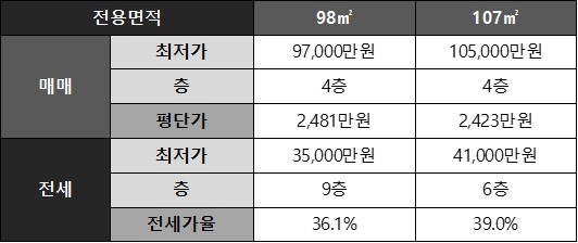 A. 98㎡는 약 2억 8천만원~4억원, 107㎡는 2억 7천만원~3억 7천만원입니다. - Q. 월세 조건은 어떻게 되나요?